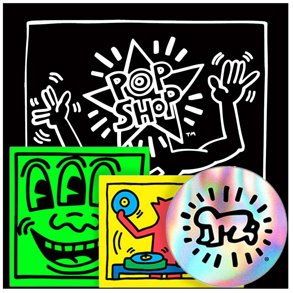 A Pack of stickers inspired by the original Pop Shop: DJ Dog, Three-Eyed Face in fluorescent ink, and Radiant Baby in rainbow holographic.